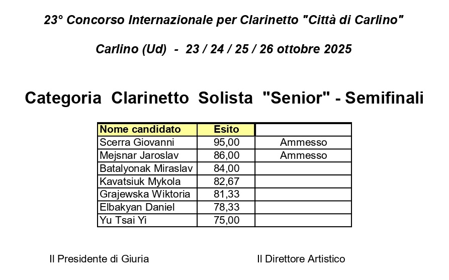 Di seguito verranno riportati i risultati delle varie fasi della categoria Clarinetto Solista Senior.